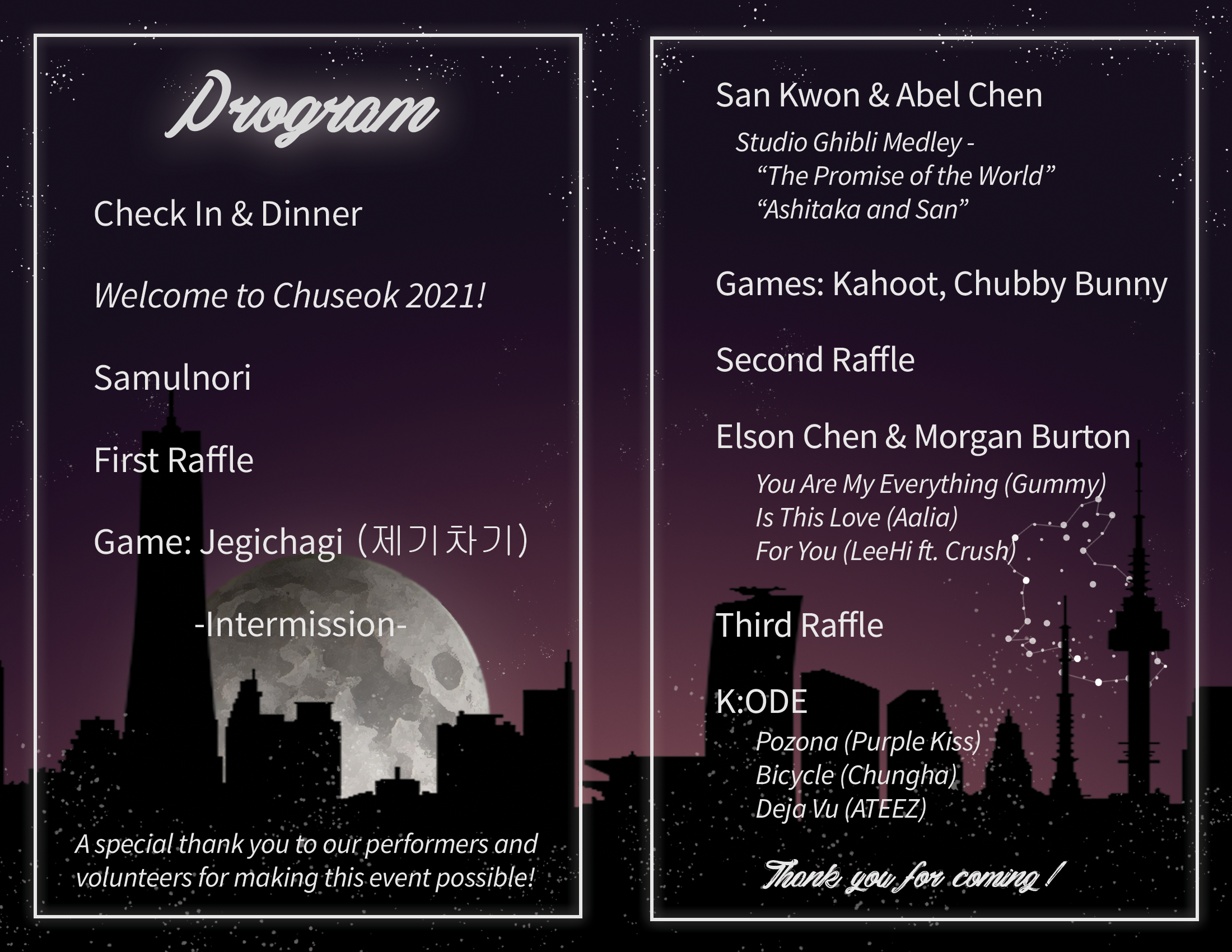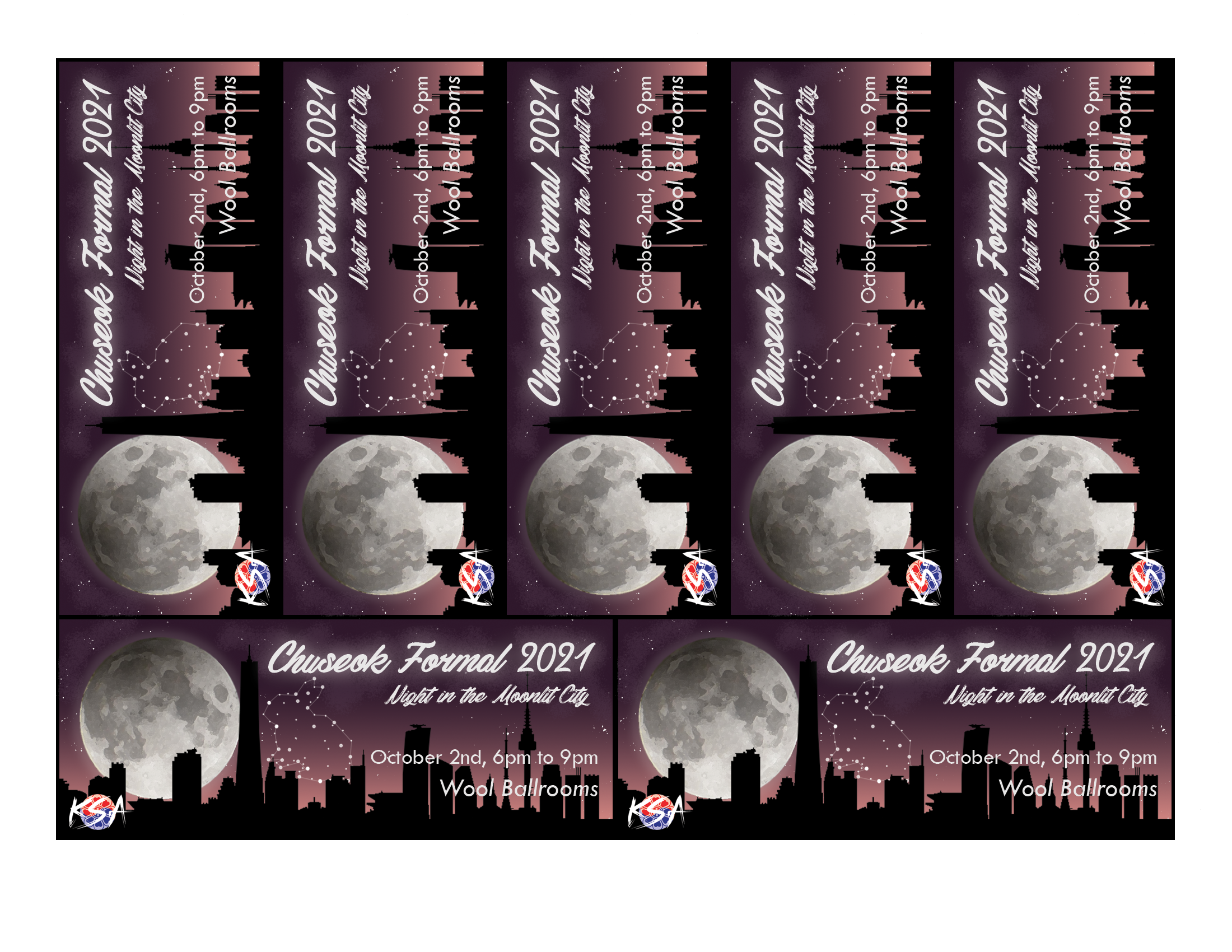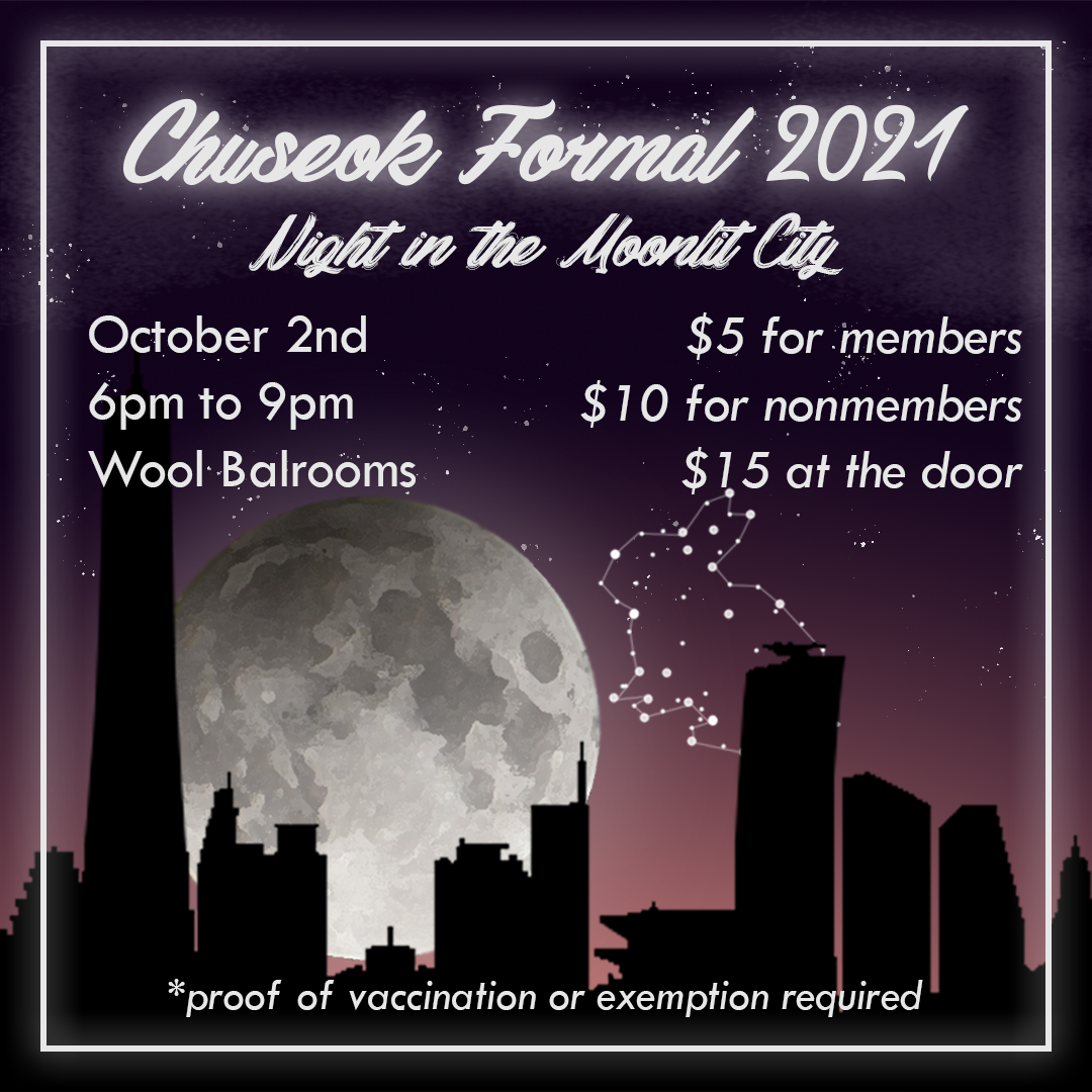 As with Chuseok 2019, these are the different forms the design for Chuseok 2021 took. In addition to the Facebook event banner, PowerPoint slide and template, 11×17 promotional flyer, 8.5×11 program, printed tickets, and Snapchat filter, I also created the design an Instagram post. The design went through several layers of critique from the rest of the executive board until we arrived at this final design.